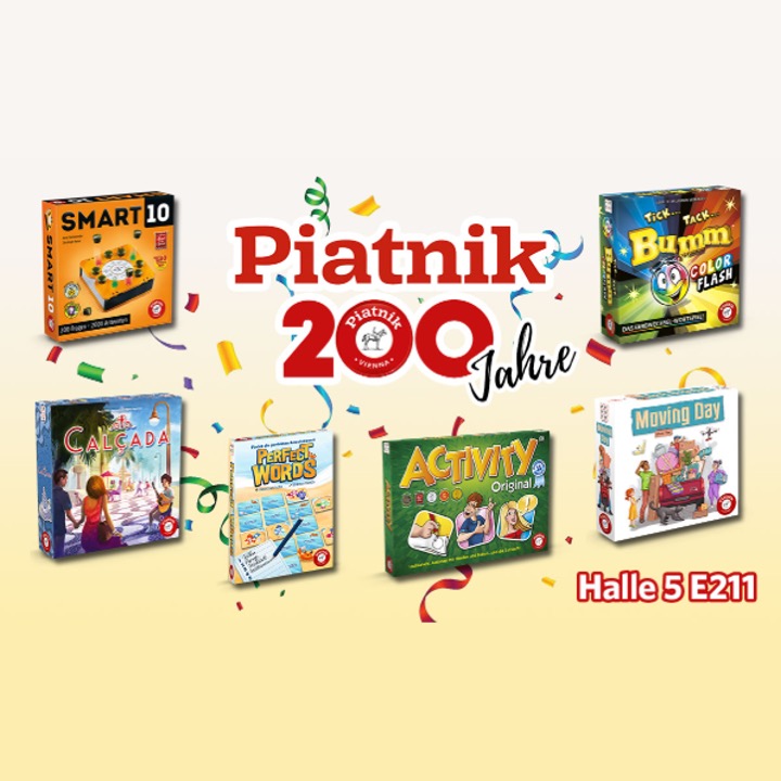 Piatnik is in the business of producing joy for exactly 200 years with classics such as Activity, Tick Tack Bumm & Smart 10! These will be joined by our autumn novelties at Spiel in Essen. Come and try them out at the new, enlarged Piatnik anniversary stand in Hall 5 E211! A large moving box (full of prize games for our lottery) and daily bargain offers are also waiting for you there.